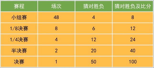 竞猜赛事将以积分式排名来确定获奖者,世界杯结束后按照累计的总分数高低,进行奖品的发放。每场竞猜猜中胜负即得对应的分数,同时猜中胜负和比分则可得双倍分数,从小组赛到决赛,每场竞猜成功获得积分将会越来越多,即使是后面加入的竞猜者也有机会获得较高的排名!