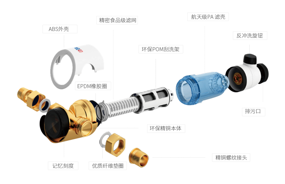 精密机械饮食级滤芯;绿色环保精铜; 航空航天级PA滤壳;环保健康POM刮洗架。