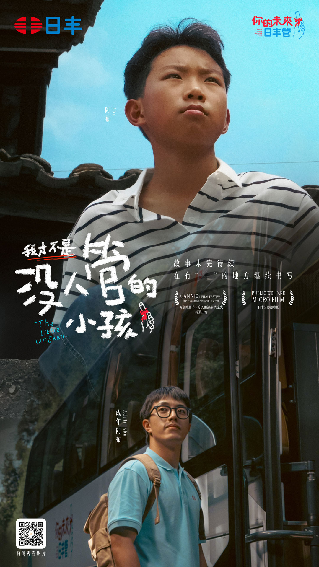 这时,影片的主角人设雏形出现在我们脑海里——一个从小被大家定义为“没人管的小孩”阿布。而在这个故事基础上,我们避免过分渲染苦痛,而是通过发生在助学中的故事片段,传递温暖与希望。于是我们加入了一位“爱管闲事”,事无巨细为孩子“管到底“的阿丰老师,他是所有山区支教者的代表,也是日丰助学价值观的化身。